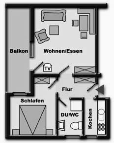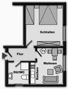 (Schlafzimmer, Wohnzimmer mit Küchenzeile, SAT-TV, Dusche/WC)